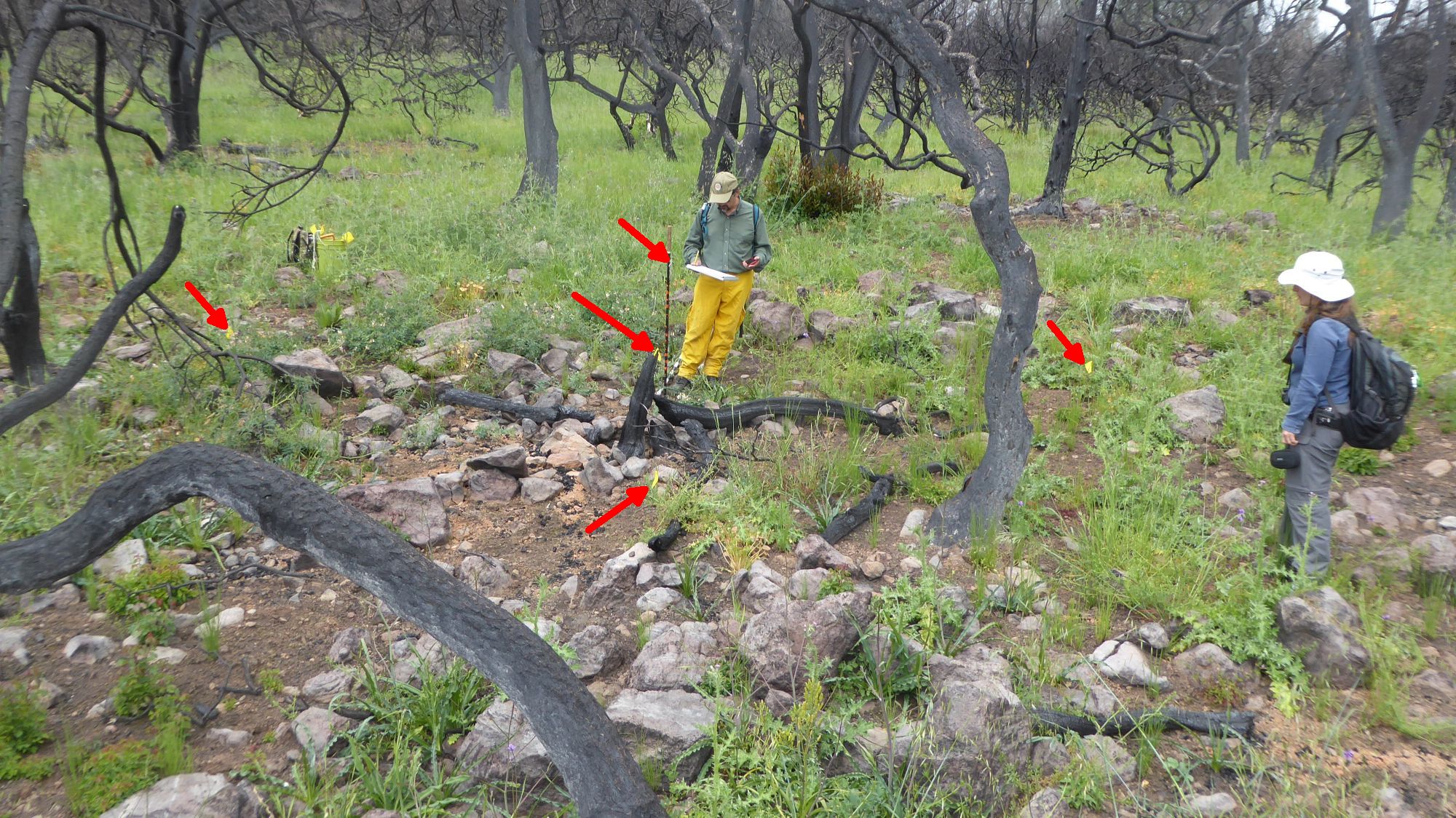 Pepperwood Preserve designed the protocol for this study. For details on the how the measurements are made see the documents posted on this website: Proposed Post-Fire Forest Assessments. To see the locations of the monitoring sites look at the tracks in the GPS Maps above.